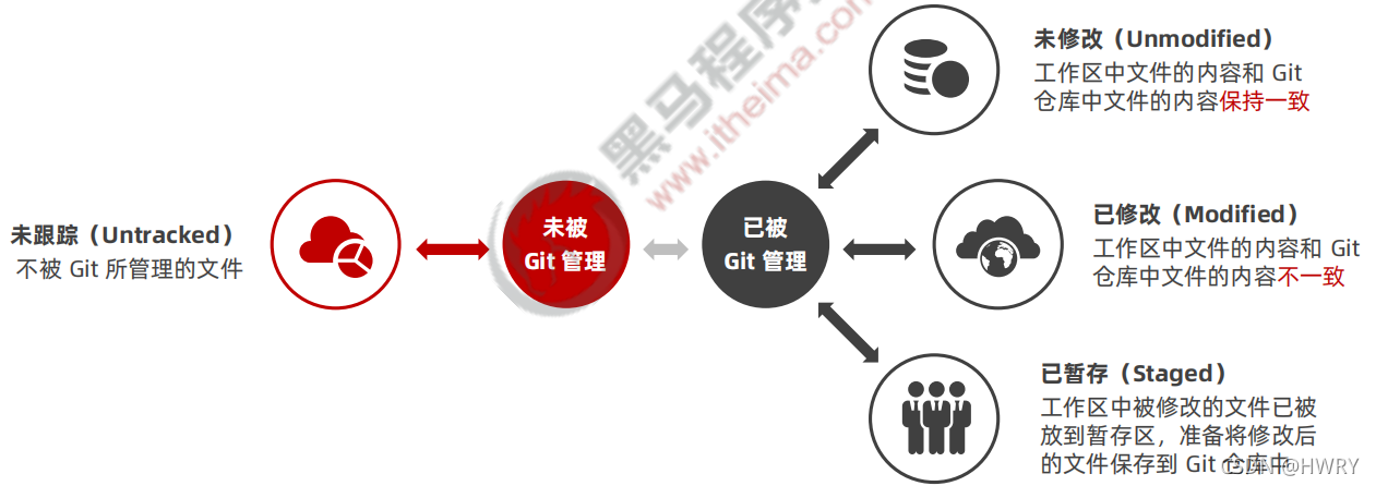 工作区中的每一个文件可能有 4 种状态,这四种状态共分为两大类,如图所示: