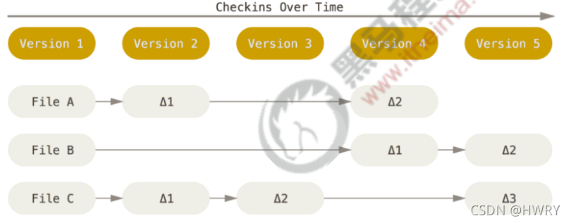 传统的版本控制系统(例如 SVN)是基于差异的版本控制,它们存储的是一组基本文件和每个文件随时间逐步累积的差异