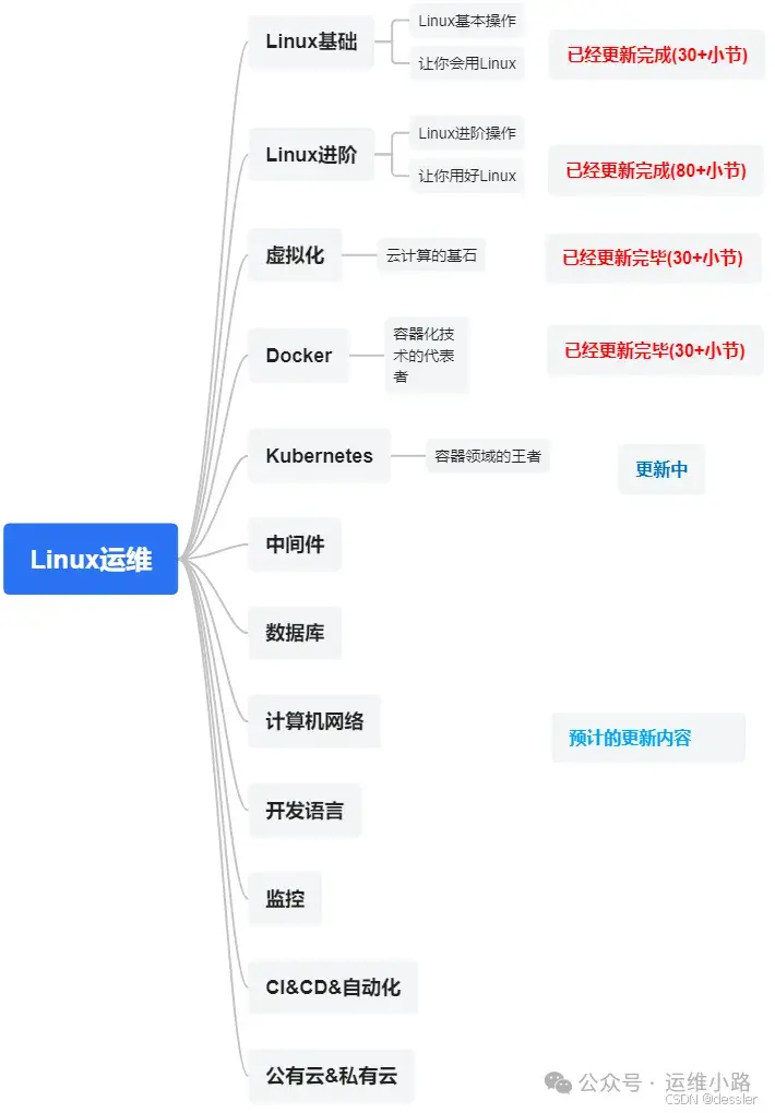 作者介绍:简历上没有一个精通的运维工程师。请点击上方的蓝色《运维小路》关注我,下面的思维导图也是预计更新的内容和当前进度(不定时更新)。