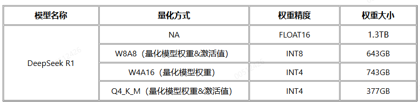DeepSeek R1满血版(671B)模型在FP16精度下,权重大小达1.3TB,W8A8量化后的权重大小仍为700G+,300I DUO单机显存(384G)无法装载,若要加载FP16精度的模型权重至少需4台服务器。