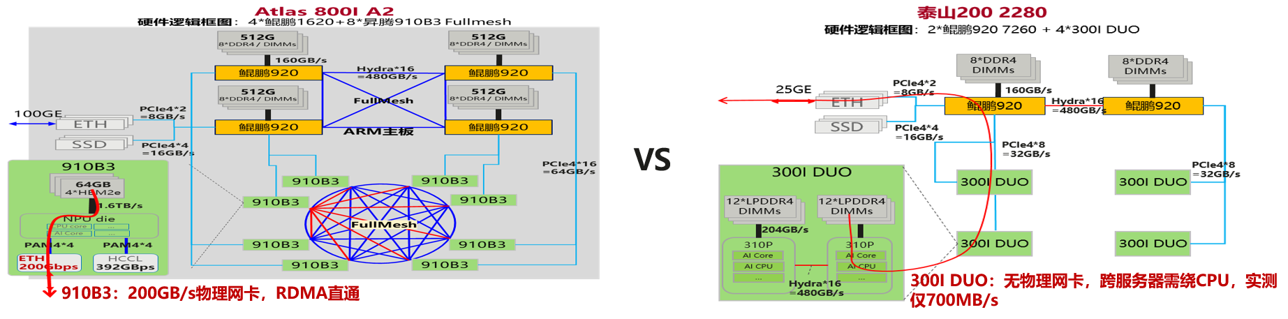 然而若使用多台300I DUO的服务器采用多机分布式的部署方式,如下图所示,由于300I DUO无物理网卡,跨节点通信需绕路CPU,性能和带宽瓶颈导致通讯受阻,实测仅700MB/s的带宽。