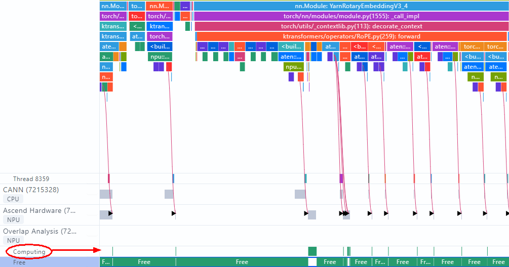 从采样结果看,Host侧和Device侧执行算子之间的连线为竖线,表示下发即计算,且Device为Computing状态的周期占比极低,Device空转周期长,这是非常典型的Host Bound现象,Host侧算子下发速度慢,其在模型单层的运行过程中耗时占比高。由于KTransformers中算子的调度和执行采用的是单算子模式,因此,我们采取了以下方式进行了算子下发时长的优化: