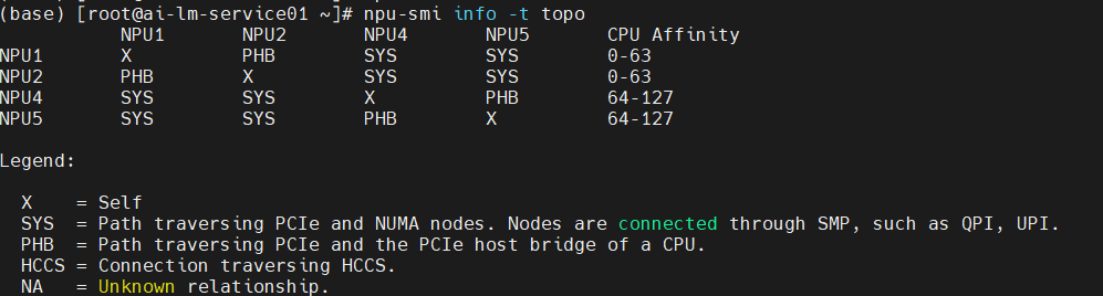 另外,除了CPU的NUMA亲和性外,CPU和NPU之间也存在亲和性关系,例如在我们的服务器上可以通过执行以下命令来查询设备CPU和NPU的亲和性关系、多NPU之间的拓扑结构。