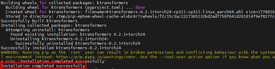 由于开源KTransformers对ARM架构的支持度不高,社区发布的Release版本中的whl包也只有X86架构的,且社区源码面向的是NVIDIA的CUDA生态,因此需要在我们的鲲鹏和昇腾硬件上进行额外的代码修改和适配,包括编译脚本中增加GCC的ARM编译选项、删除ARM不支持的cpufeature三方库、CPU算子的适配、移除CUDA相关的依赖、Torch替换为Torch_NPU等,最终成功在我们的服务器(KunPeng + 300I DUO)上编译并安装完成。