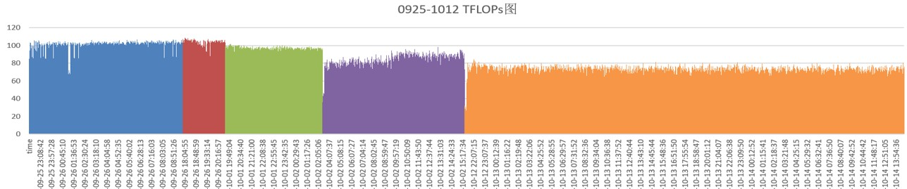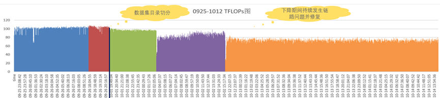 上图是某局点1.8万卡训练集群在9月25号到10月12号之间的性能变化图,图中每个颜色区域代表一次训练拉起到训练故障结束。从图中可以看到,整个集群的性能从100+TFLOPS在逐步下降并趋于稳定在60+TFLOPS(紫色块从性能从低到高,一般是由于刚拉起时性能不稳定,相对较低,之后逐步趋于稳定)。