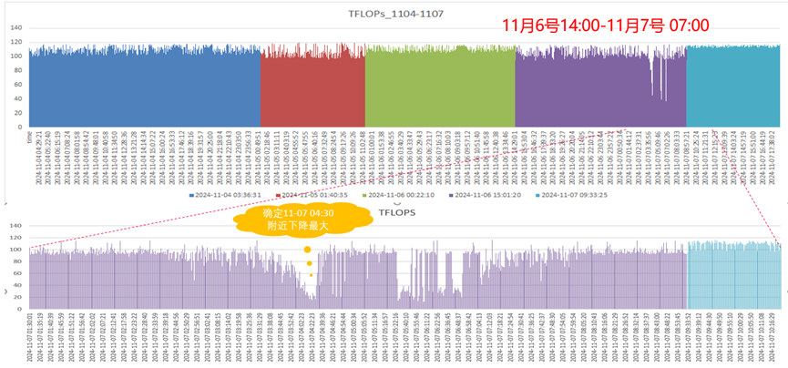 下面是某万卡集群另一起性能下降案例,该案例比较典型。可以通过下图看到11月7号04:30附近,整个集群有大幅的性能下降,大约持续3个小时后,集群性能又逐渐恢复。