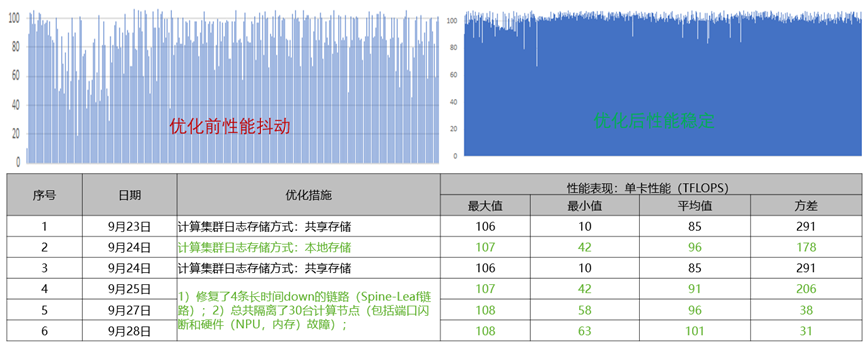 其次通过CCAE告警发现,有4条长时间down的Spine-Leaf的链路,同时有大量的端口闪断和硬件告警。因此主要思路转换到解决这些链路和硬件问题上。从9月25号到9月28号期间,1)修复了4条长时间down的链路(Spine-Leaf链路);2)总共隔离了30台计算节点(包括端口闪断和硬件(NPU,内存)故障);之后发现集群性能均值提升到100+TFLOPS,另外方差降低到了31,抖动幅度降低到正常水平,解决了性能抖动问题,达到了客户预期。