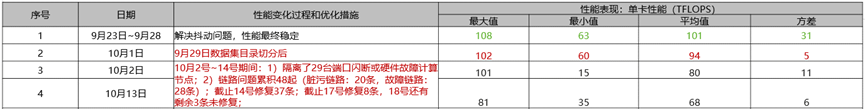 上图是相关排查结果,9月28号,解决性能抖动问题,性能最终稳定在101TFLOPS左右,9月29号数据集目录切分后,性能开始下降,下降到94TFLOPS左右,之后10月2号~14号期间:1)隔离了29台端口闪断或硬件故障计算节点;2)链路问题累积48起(脏污链路:20条,故障链路:28条);截止14号修复37条;截止17号修复8条,18号还有剩余3条未修复;