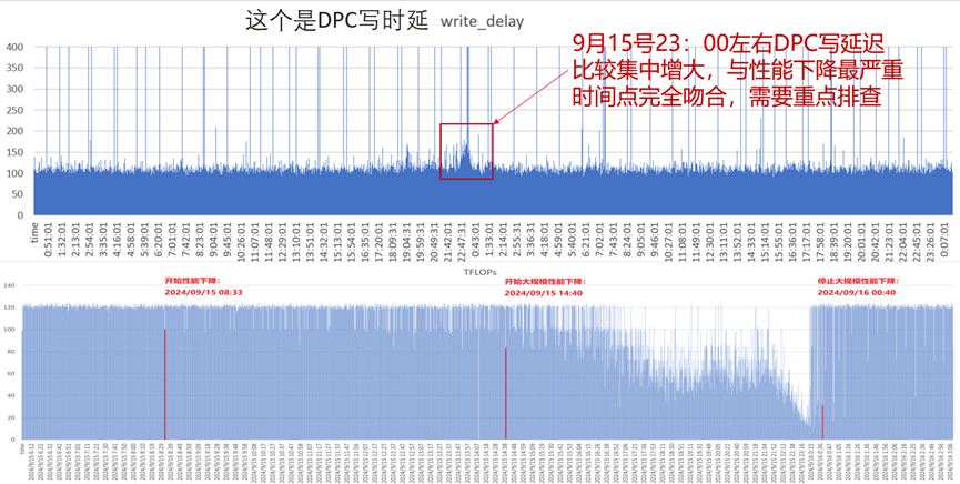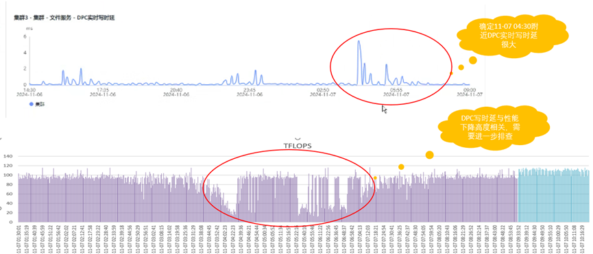 DPC写时延的统计方式是每T长时间内(粒度有10秒,30秒…),所有DPC客户端(每个计算节点一个DPC客户端,1.6万卡,2千计算节点,则有2千个DPC客户端)的写时延的平均值,也就是在时间维度(T长时间)和DPC客户端维度双向取平均(目前没有最大,最小,方差,分位数统计),平均值尖刺则代表着最大值可能更大,而训练集群的特点是整个集群单步运算中的最慢节点决定了整个集群的性能,因此经过算存网三方关键指标数据统一分析,我们认为存储DPC实时写时延尖刺问题大概率是本次集群性能下降的原因。