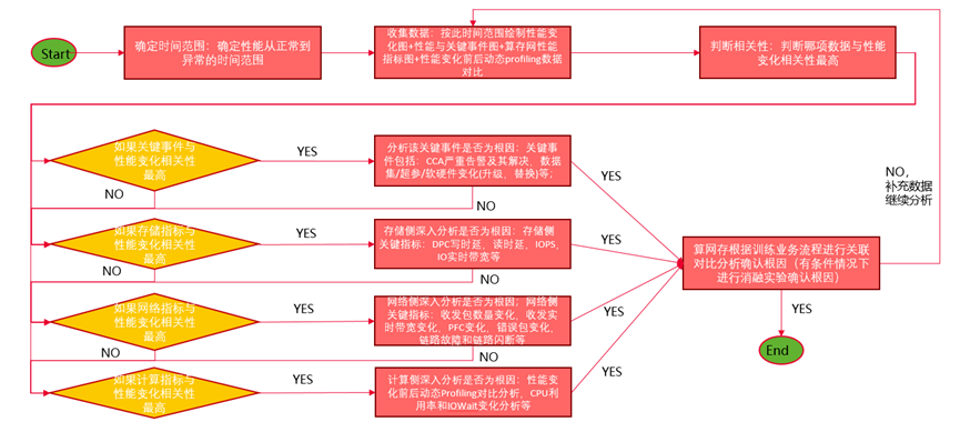 根据上面根因分析,以及通过对已知所有训练性能问题及其解决案例的梳理,我们整理了下面这张大规模训练集群性能问题解决流程图。