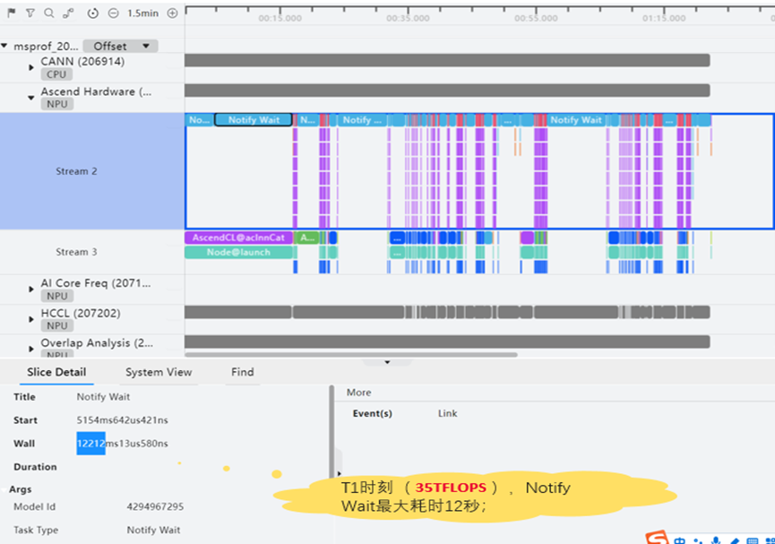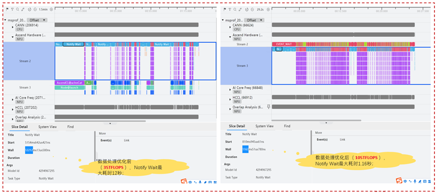 发现数据处理优化后,最大的Notify Wait耗时已经从之前的12秒下降到了1.16秒,进一步验证了CPU侧存储访问不同步导致的卡间不同步是性能差的根因。