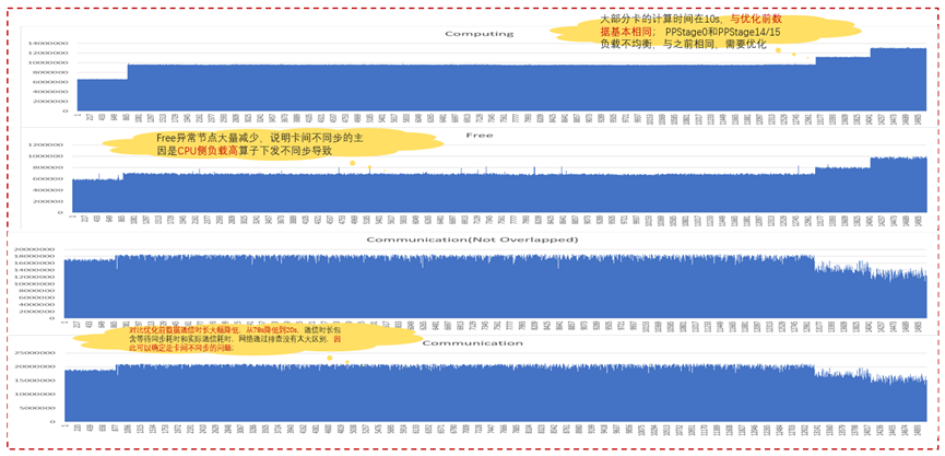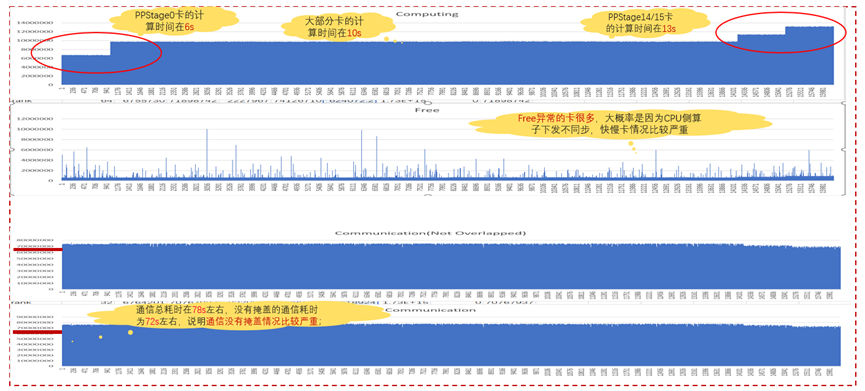 - 当前的profiling工具不完善,还不足以支撑解决所有集群性能问题:当前的profiling工具沿用之前的小模型profiling工具,在集群层面统计的可用数据太少(只有计算,通信和Free)不足以支持定位所有问题,只能指出方向;