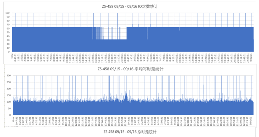 随机抽查几台计算节点DPC客户端数据分析,如下图,发现在集群性能下降期间的DPC的IOPS数据降低,同时对应的写时延增大的密度比较高。