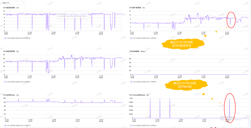 为了搞清楚集群性能下降和恢复的原因,我们按照上述解决流程图,围绕11-07 04:30排查算网存关键指标和关键事件。