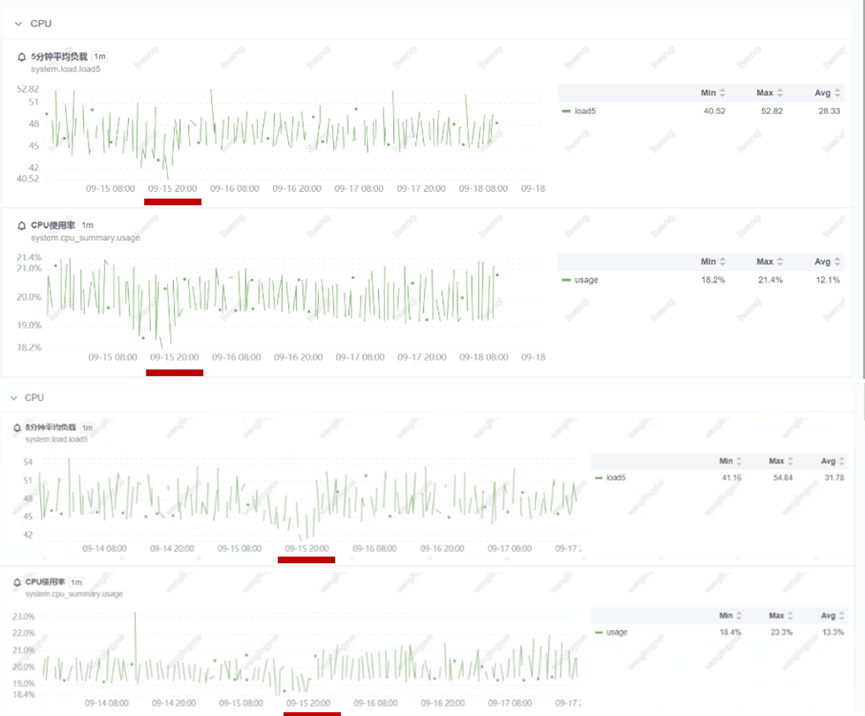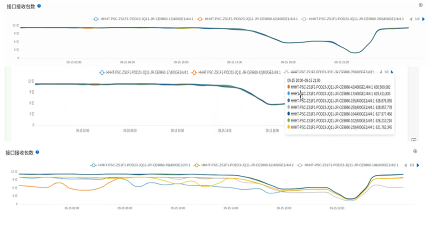 随机抽查的7台交换机在性能下降期间均存在发送、接收包数变少的现象,持续的时间大约在09/15 14:00 – 09/16 00:00左右,与性能下降时间段吻合,且均无丢包计数。可以确认性能下降期间交换机没有故障,且 NPU 普遍存在向交换机发送数据量变少的现象。