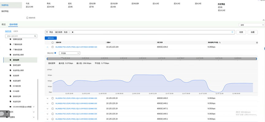 按照性能问题排查流程,我们开始收集算存网关键性能指标,开始排查。首先看网络指标,网络上端口闪断、链路故障、PFC反压,丢包,错包数据中都没有明显异常,但在接收包数和发送包数中,随机抽查了7台交换机,都存在类似下面的图形,其与性能缓慢下降的波形非常吻合。