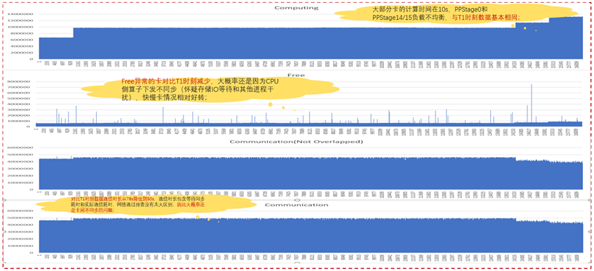 - 大部分卡的计算时间在10s,PPStage0和PPStage14/15负载不均衡,与T1时刻数据基本相同;