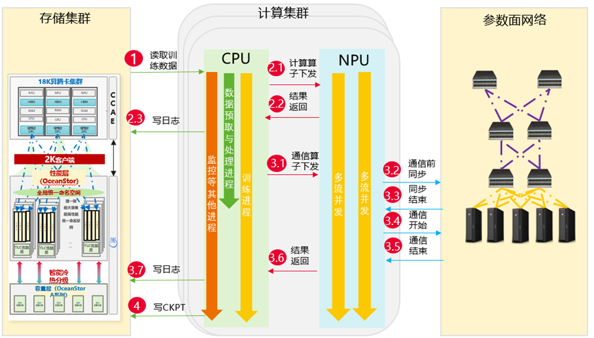 上图是训练集群算存网之间的主要训练流程(为了突出性能根因简化描述):