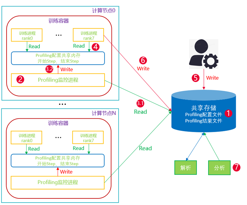 - Profiling监控进程将新的配置信息读入共享内存,各训练进程同步最新配置信息后判断开始profiling,并将profiling结果写入共享存储;