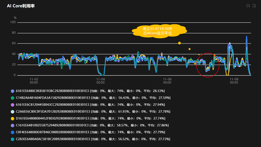 通过整个训练流程分析,CPU侧训练进程相关IO的访问主要是远程存储的读训练数据,写日志和写CKPT,除此外没有其他IO操作,因此大概率怀疑是该时刻存储集群可能有异常。同时,计算侧也排查了11-07 04:30附近的AI Core利用率,发现该时刻附近,AI Core利用率低,如下图所示。经过分析,AI Core利用率低的原因大概率是该时段CPU侧等待IO,导致算子下发慢,算子下发间隔大,导致AI Core空转,导致AICore利用率低。