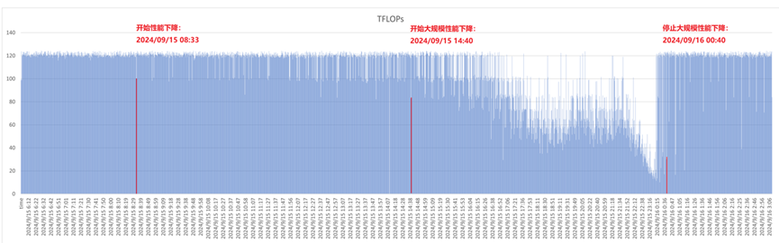 下面是某8千卡集群性能下降10小时后又恢复的案例,该案例也比较典型。可以通过下图看到9月15号14:40开始下降,9月16号00:00附近下降到最低谷后又突然恢复,整个下降大约持续了3个小时左右。