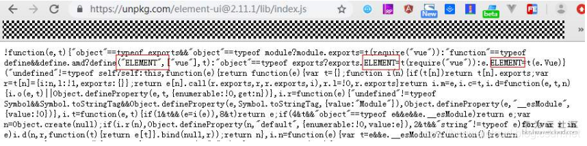 外部引入库时需要注意命名,比如上例中的ELEMENT,开发者通常会填写为自己在代码中使用的ElementUI而引起报错,当不确定名称时,有个简单的办法就是找一个CDN的资源看一下,通常代码最开始都是