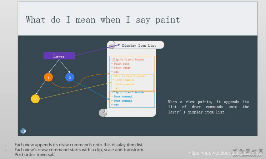 views中支持的属性包含Clip剪裁,transform变换,effect效果(如半透明或滤镜等),mask遮罩,通常按照后序遍历的方式自底向上进行遍历处理。