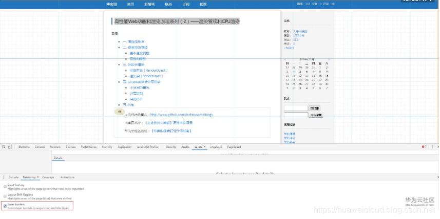 每个层layer是由若干个views组成的,所谓paint,就是每个views将自己对应图形的绘制指令添加到层的可展示元素列表Display Item List里,这个列表会被添加到一个延迟执行的光栅化任务中,并最终生成当前层的texture纹理(可以理解为当前层的绘制结果),考虑到传输性能以及未来增量更新的需求,光栅化的结果会以tiles瓦片形式保存。在chrome中也可以看到页面瓦片化拆分的结果: