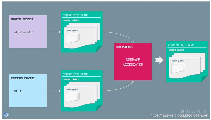 chromium是多进程架构,Browser Process浏览器进程会对菜单栏等等容器部分的画面生成合成帧来输出,每个网页的Render Process渲染进程会对页面内容生成合成帧来输出,最终的结果都被共享给GPU ProcessGPU进程进行聚合并生成最终完整的合成表面,接着在Display Compositor环节将最后的位图展示在屏幕上。