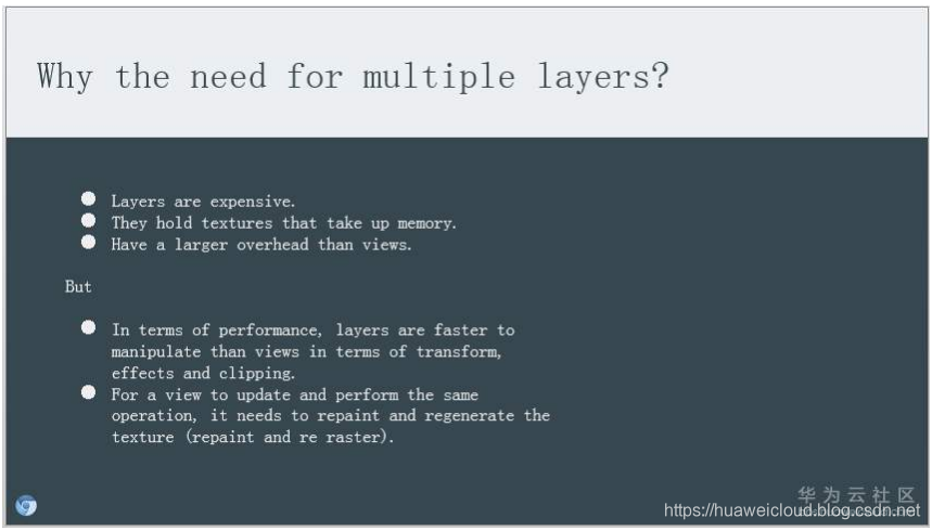 【软件渲染】的模式下,在paint时会直接利用Graphics Context绘图上下文将结果绘制出来,在一个SkBitmap实例中保存为位图信息;【硬件渲染】的模式下,在paint时传入一个SkPicture实例,将需要执行的绘图命令保存在里面先不执行,然后通过共享内存将它传给GPU进程,借助GPU来最终去执行绘图命令,生成多个瓦片化的位图纹理结果(OpenGL中顶点着色器向片元着色器传递数据时可以自动进行数据插值,完成光栅化的任务)。 纯软件渲染里严格说是没有合成层概念的,因为最终输出的只有一张位图,按照顺序从下往上画,和画到一个新层上再把新层贴到已有结果上其实是一样的。