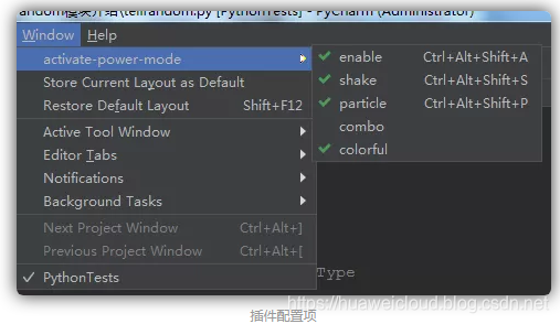 我们在pycharm顶层Window栏可以看到activate-power-mode的相关选项: