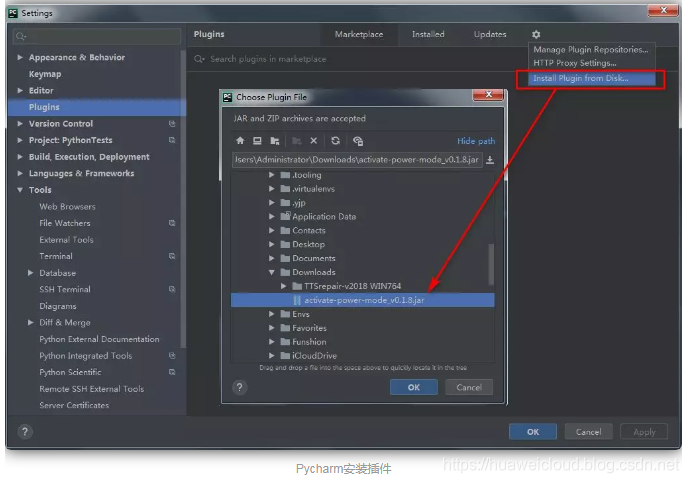 由于pycharm版本的差异,老版本的pycharmInstall plugin from disk按钮在Plugins的右下角,2019版的收缩在齿轮内部了,无伤大雅。