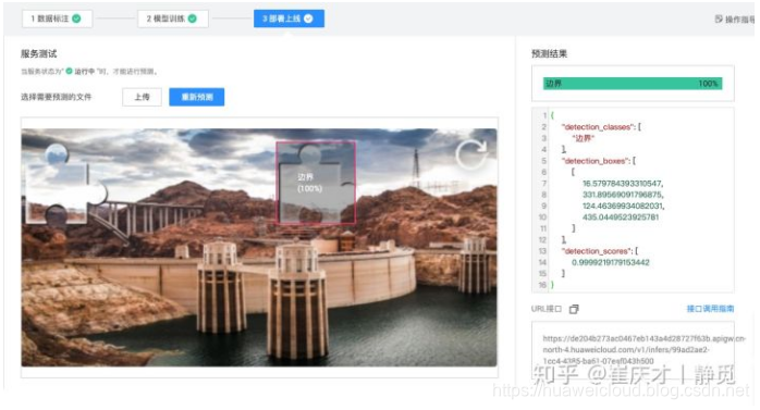 有了这个结果,我们下一步模拟滑动到标注结果的左边界位置就好了!具体的模拟过程这里就不展开讲了。 另外平台同时还提供了模型部署后的 URL 接口和接口调用指南,也就是我们只需要向接口上传任意的验证码图片,就可以得到缺口的位置了!调用方式可以见:https://support.huaweicloud.com/engineers-modelarts/modelarts_23_0063.html。