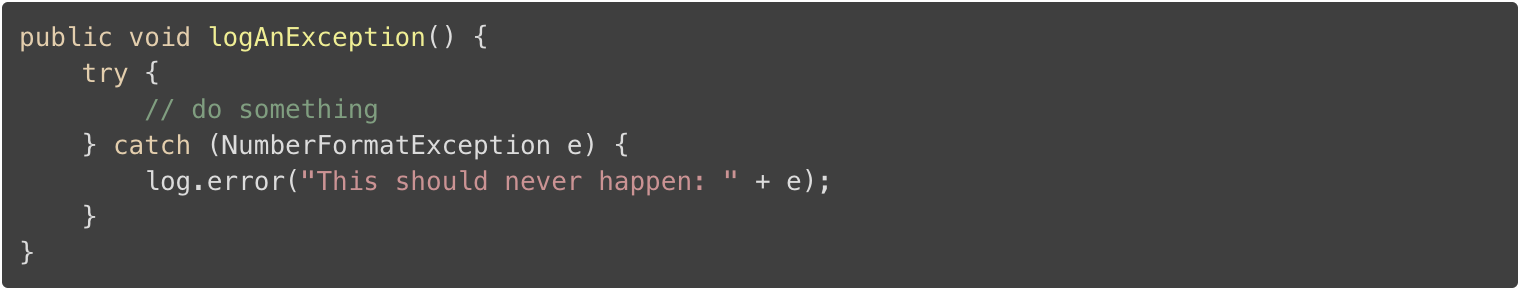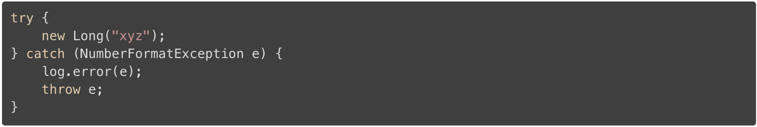 这可能是该文章中最常被忽略的最佳实践。 你可以找到很多的其中有一个异常被捕获的代码片段,甚至是一些代码库,被记录和重新抛出。