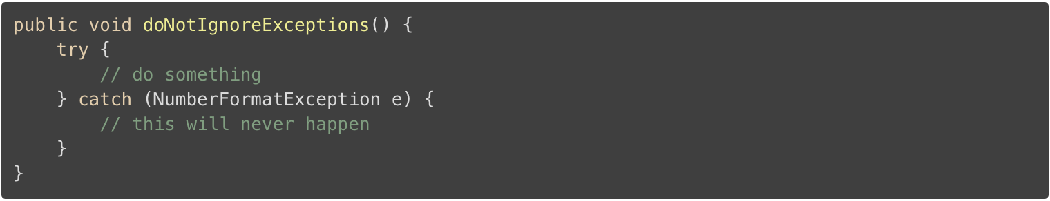 所以,请不要忽略任何一个异常。 你不知道代码将来如何改变。有人可能会在没有意识到会造成问题的情况下,删除阻止异常事件的验证。或者是抛出异常的代码被改变,现在抛出同一个类的多个异常,而调用的代码并不能阻止所有异常。