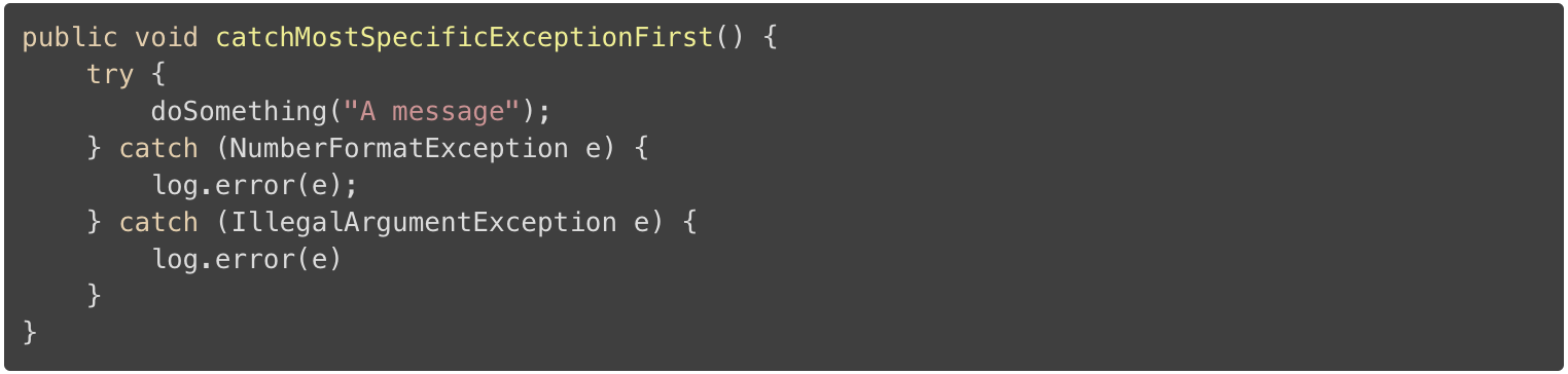 大多数 IDE 都可以帮助你实现这个最佳实践。当你尝试首先捕获较不具体的异常时,它们会报告无法访问的代码块。