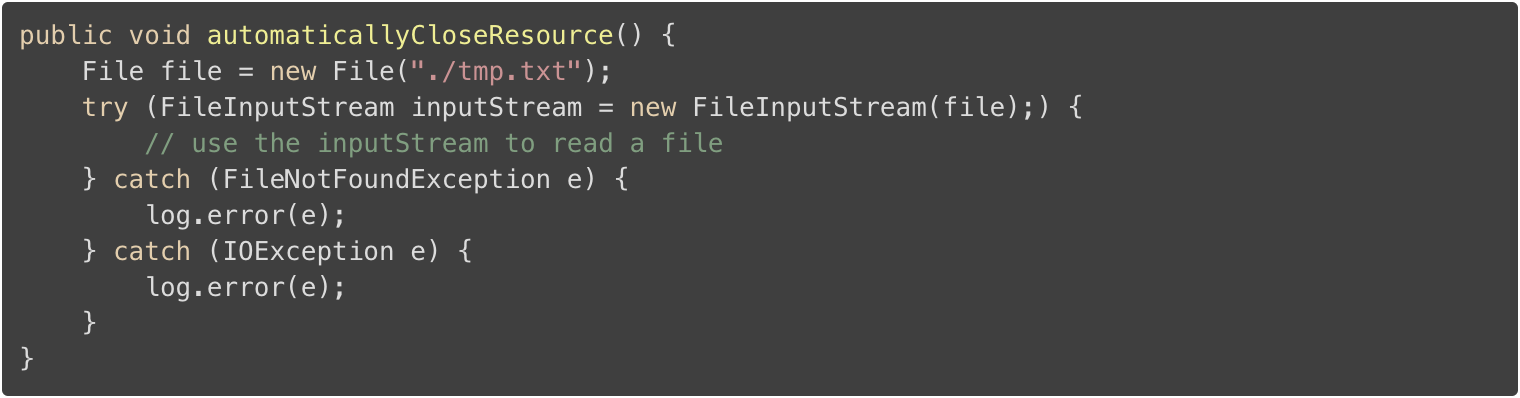 如果你的资源实现了 AutoCloseable 接口,你可以使用这个语法。大多数的 Java 标准资源都继承了这个接口。当你在 try 子句中打开资源,资源会在 try 代码块执行后或异常处理后自动关闭。