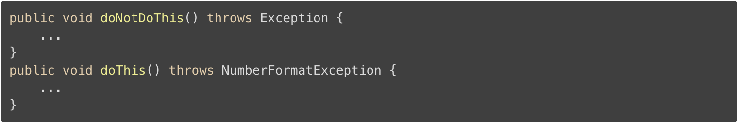 因此,总是尝试寻找最适合你的异常事件的类,例如,抛出一个 NumberFormatException 来替换一个 IllegalArgumentException 。避免抛出一个不明确的异常。