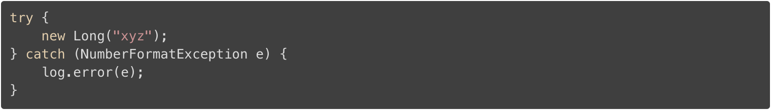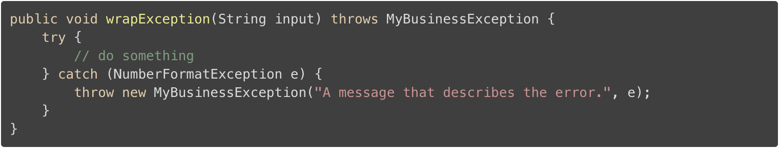 在你这样做时,请确保将原始异常设置为原因(注:参考下方代码 NumberFormatException e 中的原始异常 e )。Exception 类提供了特殊的构造函数方法,它接受一个 Throwable 作为参数。另外,你将会丢失堆栈跟踪和原始异常的消息,这将会使分析导致异常的异常事件变得困难。