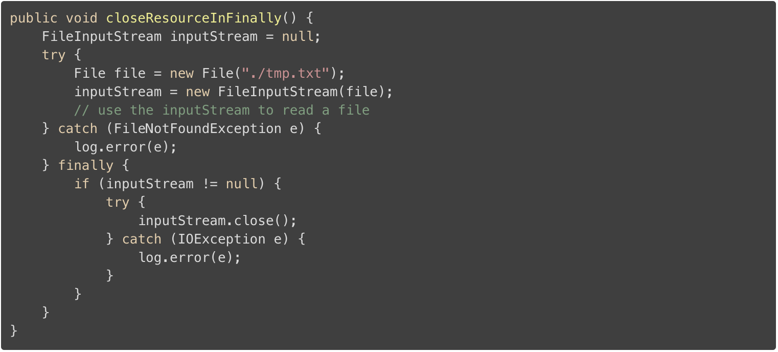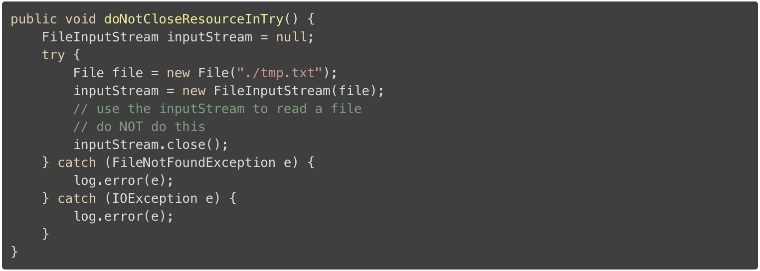 大部分情况下,在 try 代码块中使用资源后需要关闭资源,例如 InputStream 。在这些情况下,一种常见的失误就是在 try 代码块的最后关闭资源。