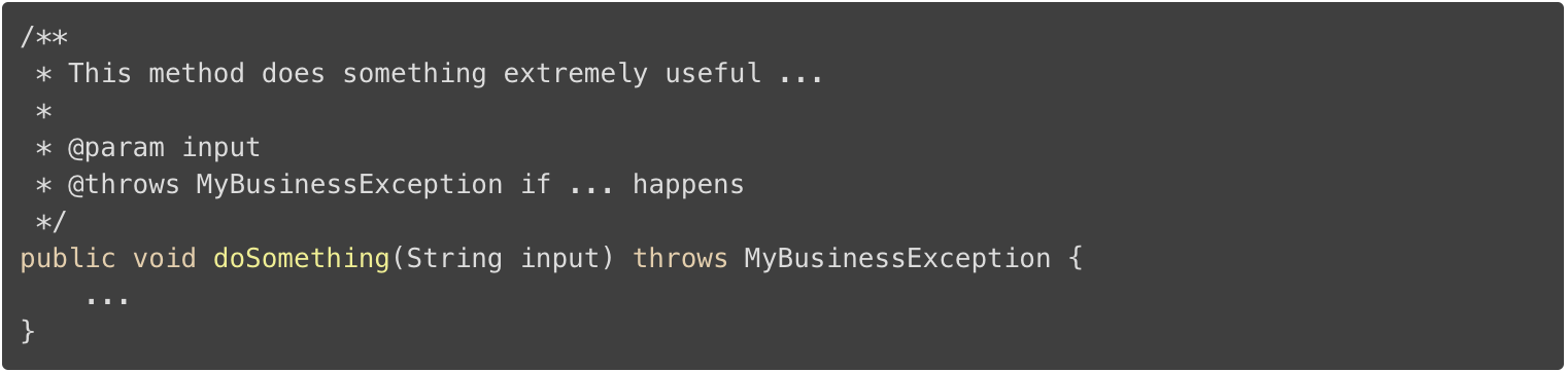 因此,请确保向 Javadoc 添加 @throws 声明并描述可能导致异常的情况。