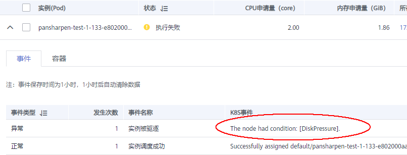 - Eviction驱逐,发现原因是节点报Disk Pressure(存储容量满了);