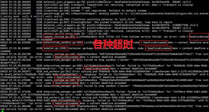 - 查询节点Kubelet日志,可以看到充满了各种超时错误: