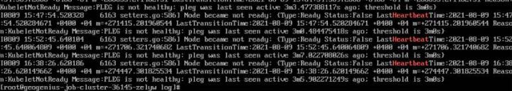 现象还是节点Unavailable了,查看Kubelet日志搜索心跳情况,发现有PLEG is not healthy 的错误: