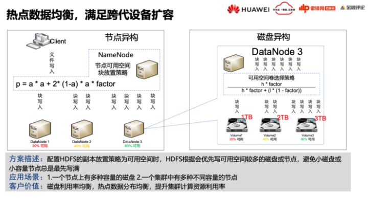 我们专门开发了按照可用空间放置数据的能力,保证了数据是按照磁盘以及节点的可用空间进行放置。同时,对跨代节点按规格进行资源池划分,对于早期比较老旧且性能相对差一些的设备,可以组成一个逻辑资源池用于跑Hive作业,而内存多的新设备组成另一个资源池则用来跑spark,资源池通过资源标签进行区分隔离,分别调度。