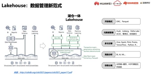 LakeHouse就是期望解决数据湖与数仓的融合分析的问题。LakeHouse提出通过提供ACID的开放格式存储引擎来解决数据的时效性问题,开放格式另一个好处在于数据湖里的数据可以面向多种分析引擎,如Hive、Spark、Flink等都可以对数据进行访问分析,而且AI引擎也可以访问Lakehouse数据做高级分析。