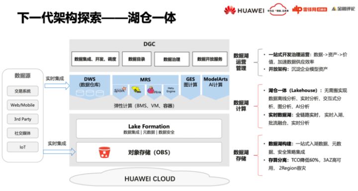 2015年之后,对数据系统进行整合合并,包括通过GaussDB替代Teradata数仓,形成了融合数仓,在工行被称之为一湖两库,以FusionInsight构建数据湖底座以支持全量的数据加工,同时实时分析、交互式分析等业务也在其中得以开展。