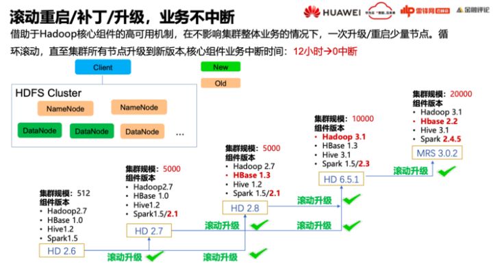 滚动升级的策略可实现集群节点一个一个滚动分时升级,逐步将所有节点全部升级成最新的版本。但是开源的社区跨大版本并不保证接口的兼容性,会导致新老版本无法升级。因此我们研发了很多的能力以保证所有版本之间都能滚动升级。从最早的Hadoop版本一直到Hadoop3,所有的组件我们都能保证滚动升级。这也是大集群的必备能力。