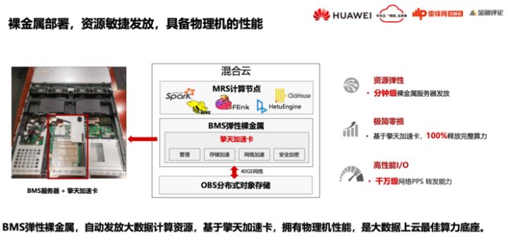 网络部分有专门的擎天网络加速卡,对裸机网络进行管理,而且网络性能比原来的物理网卡的性能更高,在裸金属服务器上开展大规模大数据业务是云上的最佳部署方案。