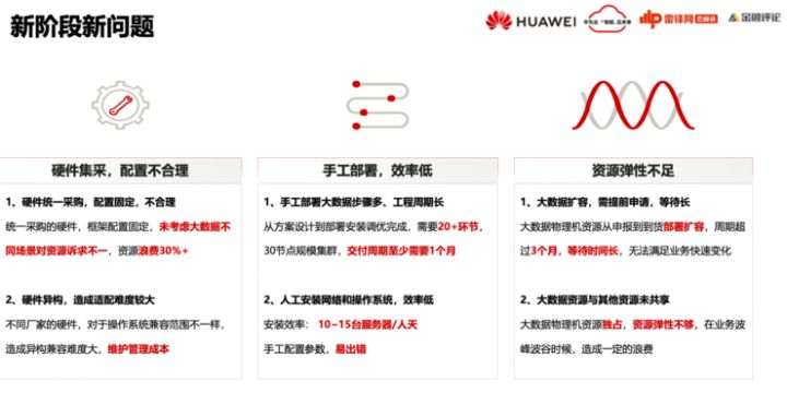 再次,大数据手工部署效率低。往往开展一个新业务的时候,从硬件的采购到网络配置、再到操作系统安装,整个系统交付周期至少需要一个月。